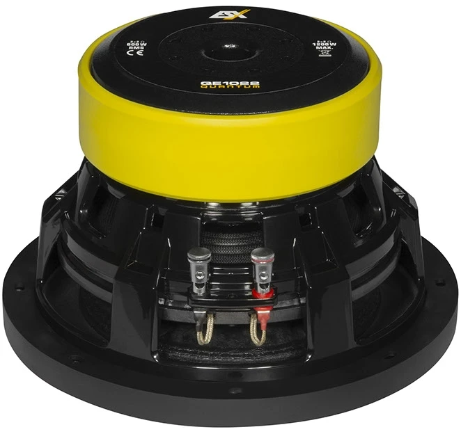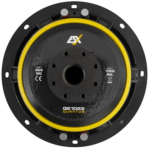 QUANTUM QE Subwoofer bestechen durch ihre sehr kompakte Bauform. Fast schon zierlich kommt der QE622 Subwoofer rüber, aber mit seinem Aluminium-Druckguss-Korb, den Doppelmagneten mit 2 x 40 oz und der vernähten Sicke signalisiert er: „Vorsicht, es kann sehr laut werden!“ Die beiden größeren Subs haben einen kräftigen 2 x 63 oz Doppelmagneten und genau wie der QE622 eine Polkernbohrung sowie eine belüftete T-Plate für optimale Kühlung. Beim QE622 kommt eine große 2“ (50 mm) Schwingspule mit einer RMS Belastbarkeit von 250 Watt und beim QE822 und dem ganz neuen Modell QE1022 sogar eine 2,5“ (64 mm) Schwingspule mit einer Belastbarkeit von 400 bzw. 600 Watt RMS zum Einsatz. Extrem lang gewickelte Schwingspulen von 30 bzw. 36 mm Wickelhöhe erlauben den Woofern einen linearen Hub von +/- 10 mm. Alle drei Modelle haben eine Doppelschwingspule mit jeweils 2 + 2 Ohm. Hiermit können Impedanzen von 1 x 4 Ohm oder gar 1 x 1 Ohm konfiguriert werden. Problemlos können so auch mehrere Subwoofer hintereinander an einem Verstärker betrieben werden.