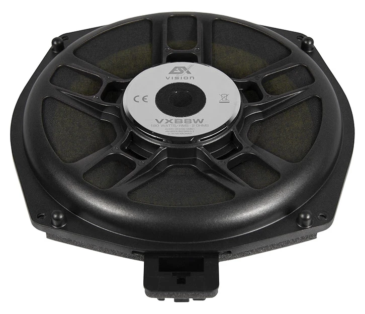 Neben den unglaublich guten Mittel- und Hochton Lautsprechern ist ganz klar das VXB Subwoofer-Duo zu nennen. Mit den großen 51 mm Schwingspulen, einer Belastbarkeit von 180 Watt RMS an 2 Ω und einer speziell auf hohe Pegel ausgelegte Kevlar-Verbundmembran, welche mit einem speziellem Schaumstoff aus Deutschland „verbacken“ wird, bringen die Subwoofer die Hosenbeine zum Flattern. Viele handelsübliche Nachrüst-Bässe für BMW sind zwar zu hören, aber nicht so wie die ESX Tieftöner auch zu spüren! Eine Freude für all diejenigen, denen ein pfundiges Bassbrett bisher gefehlt hat.