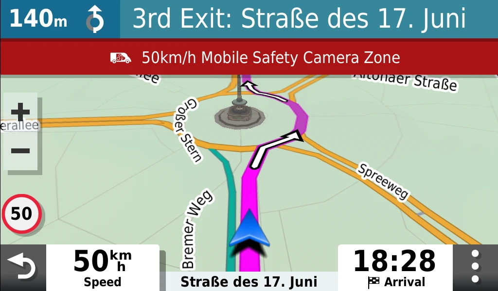 Um deine Fahrt sicherer zu machen, warnt dich die integrierte Fahrerassistenz bspw. vor scharfen Kurven, Tempoänderungen, Radarkontrollen und Bahnübergängen.