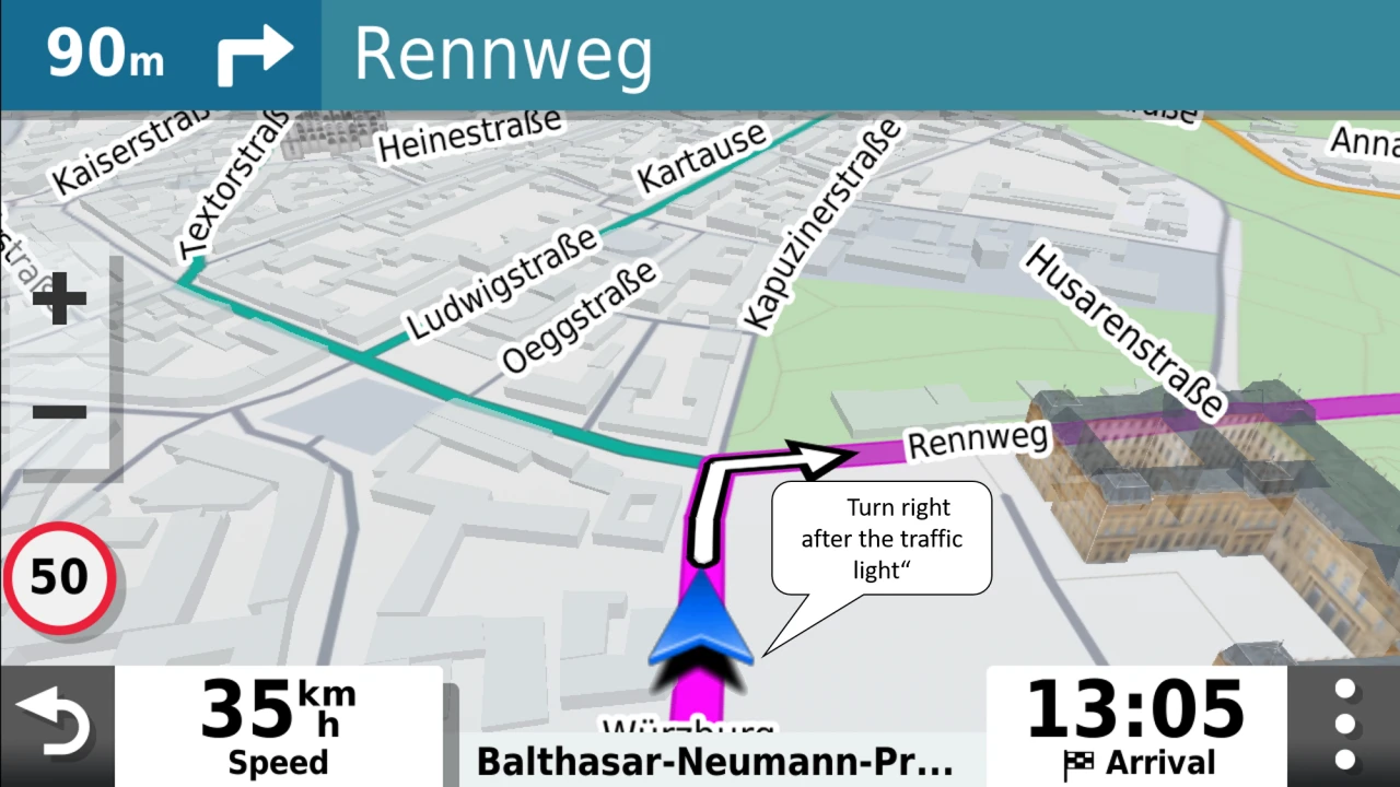 Mit leicht verständlichen Abbiegehinweisen mit Ansage von Straßennamen wirst du wie von einem guten Freund zum Ziel geführt. Die Namen von Straßen, Geschäften und gut erkennbaren Orientierungspunkten dienen dabei als Anhaltspunkte (z. B. „Rechts abbiegen nach dem roten Gebäude“).