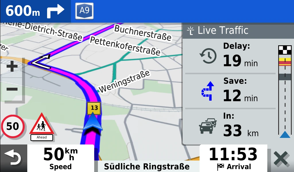 - Informationen zu scharfen Kurven, Schulen, Rotlichtkameras, Radarkontrollen und mehr