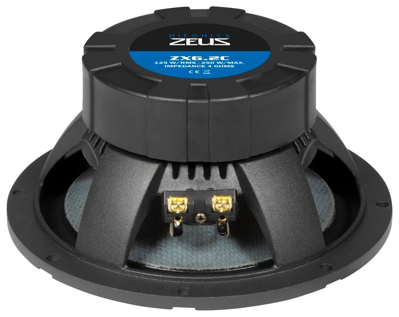 Die ZEUS Baureihen stehen im HiFonics Programm seit vielen Jahren für Power und exzellenten Klang. Erstmals stehen jetzt nebst Komposystemen und Koaxen auch Einzelkomponenten wie hochwertige Aluguss-Mitteltöner und Bässe zur Verfügung, so dass 3-Wege Kombinationen möglich werden. Der Tieftöner im Kompo-Set (separat als ZX6.2W erhältlich), kommt mit einem Aluminium-Gusskorb und einem Aluminium Phase Plug. Die Sandwich-Membran besteht aus einem 3-fachen Glasfiber-Verbundmaterial, die besonders leicht aber dennoch besonders stabil ist. Der Frequenzgang ist äußerst linear und benötigt kaum Korrekturen durch “Frequenzweichentricks“. Für viel Power sorgt der kräftige Magnetantrieb mit 14 Unzen Gewicht, der eine mit 30,5 mm sehr groß dimensionierte Schwingspule antreibt. Insgesamt wird so ein mechanischer Hub bis +/- 11 mm möglich. Der ebenfalls separat erhältliche 25 mm große Gewebe-Neodym-Hochtöner ZX6.2T mit Koppelvolumen (Resonanzfrequenz 700Hz) deckt einen besonders großen Frequenzbereich bis weit über 24 kHz sehr linear ab.