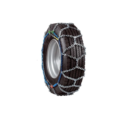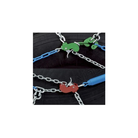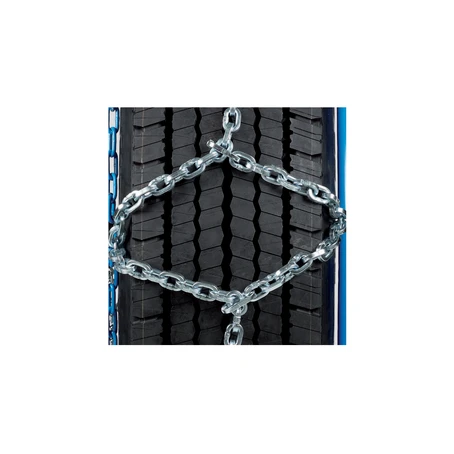 - Gehärtete und verzinkte Schneekette mit rundem Querschnitt in D-Form als 5,70 mm, 6,40 mm, sowie Querschnitt D-Plus als 7,75 mm Kettengliedstärke.