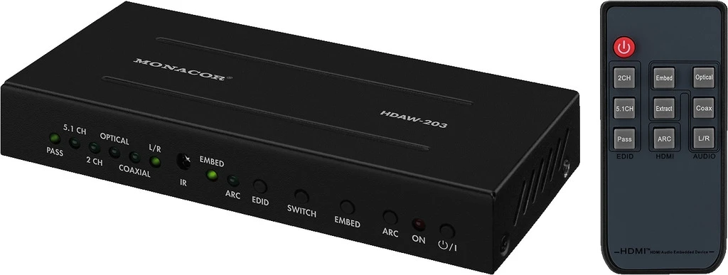 HDAW-203 moduliert/demoduliert ein Audiosignal auf das HDMI™-Signal. Somit kann eine abgesetzte Audioquelle über eine bestehende HDMI™-Verbindung eingespeist oder ein vorhandenes Audiosignal extrahiert werden. Die Auswahl der Audiosignalquelle erfolgt über eine beiliegende Fernbedienung. - 1 x HDMI™-Eingang, 1 x HDMI™-Ausgang