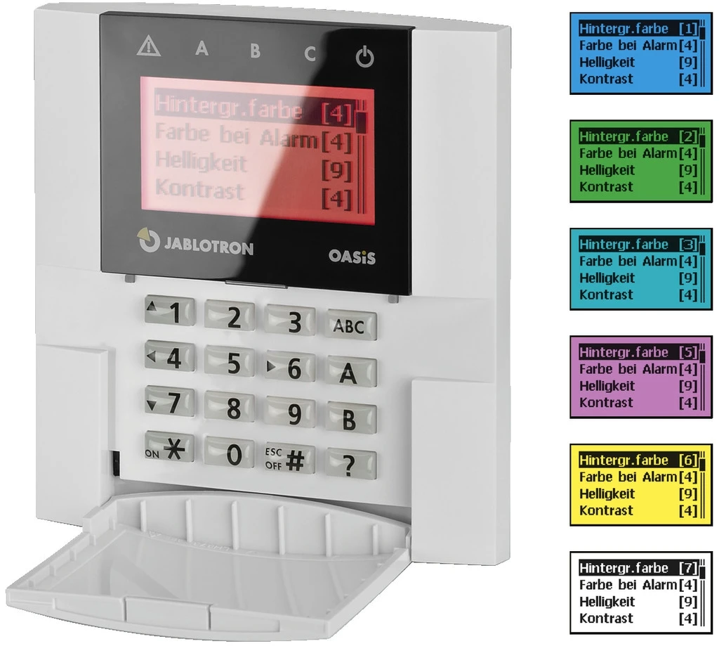 - LC-Grafik-Farbdisplay mit einstellbarer Hintergrundfarbe (Blau, Gelb, Grün, Lila, Rot, Türkis), separate Farbeinstellung für den Alarmfall dient als zusätzliches, optisches Signal