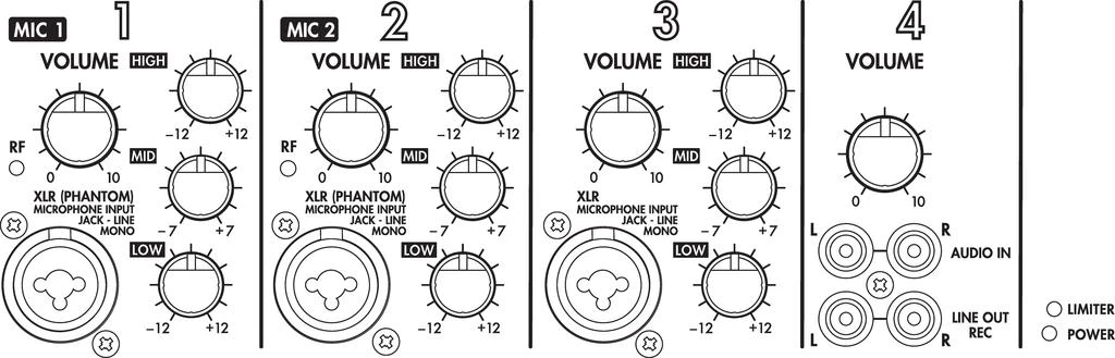 - 3 Eingänge über Kombi-Buchse Mic (XLR)/Line (6,3-mm-Klinke) mit 3-fach-Klangregelung und Gainregler