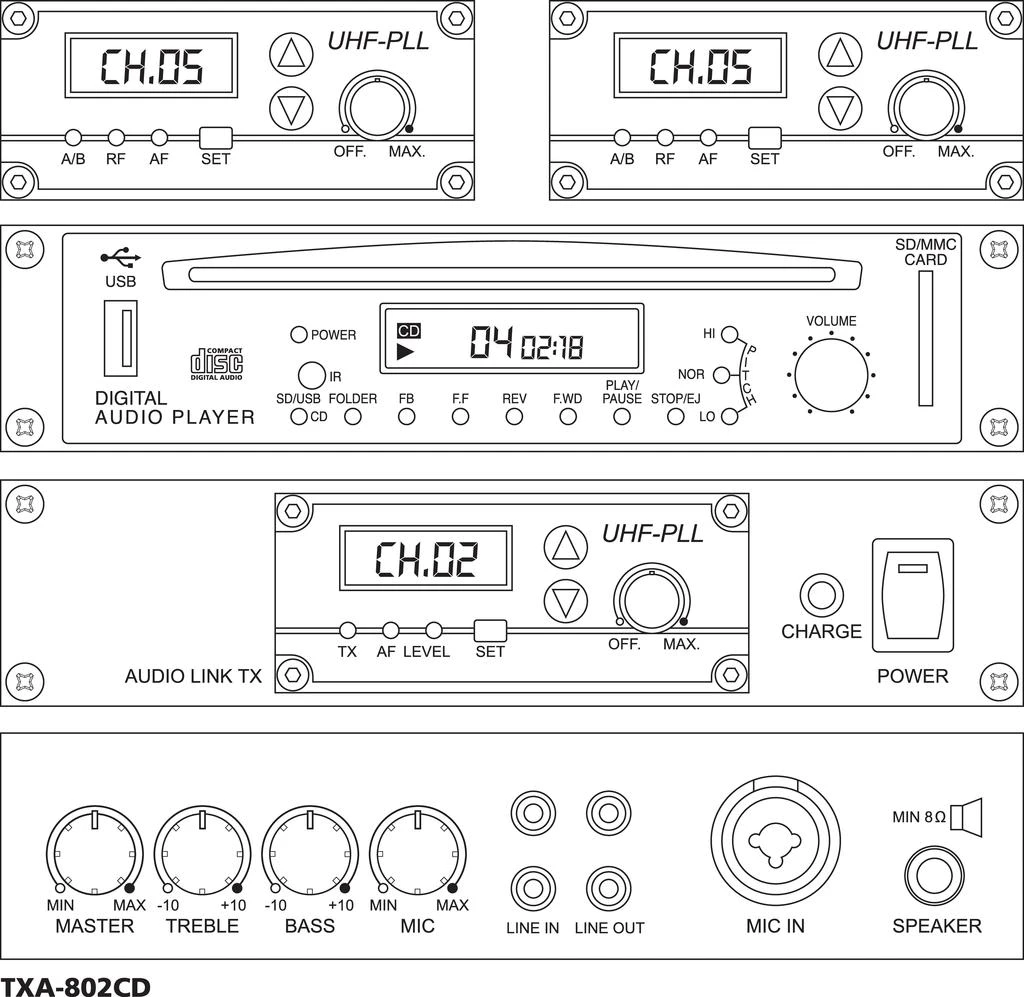 Der integrierte Funksender des TXA-802CD und TXA-1002CD sendet Audiosignale drahtlos an ein oder mehrere TXA-800- oder TXA-1000-Systeme. Ideal für die gleichmäßige Beschallung von größeren Räumen.
