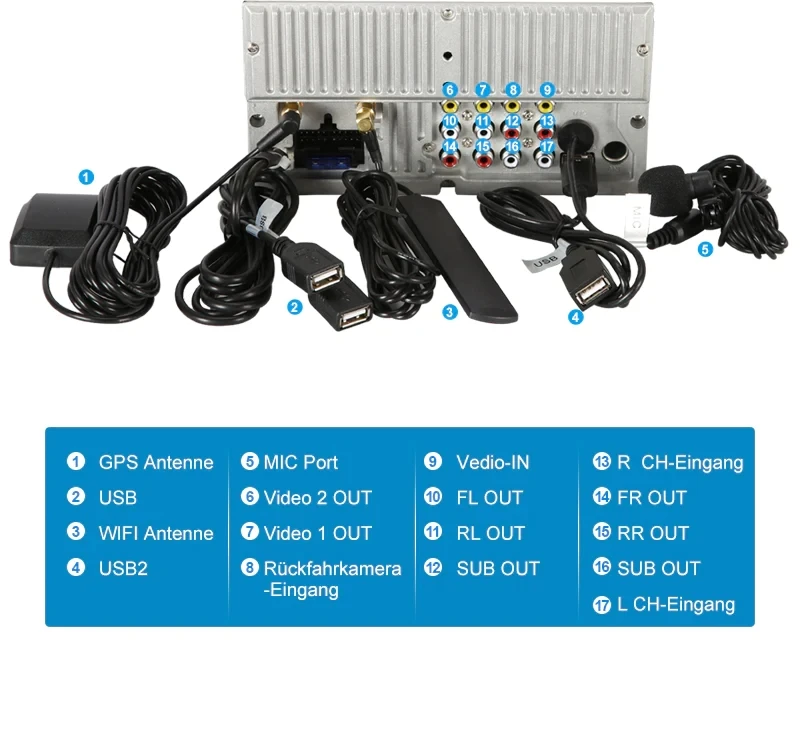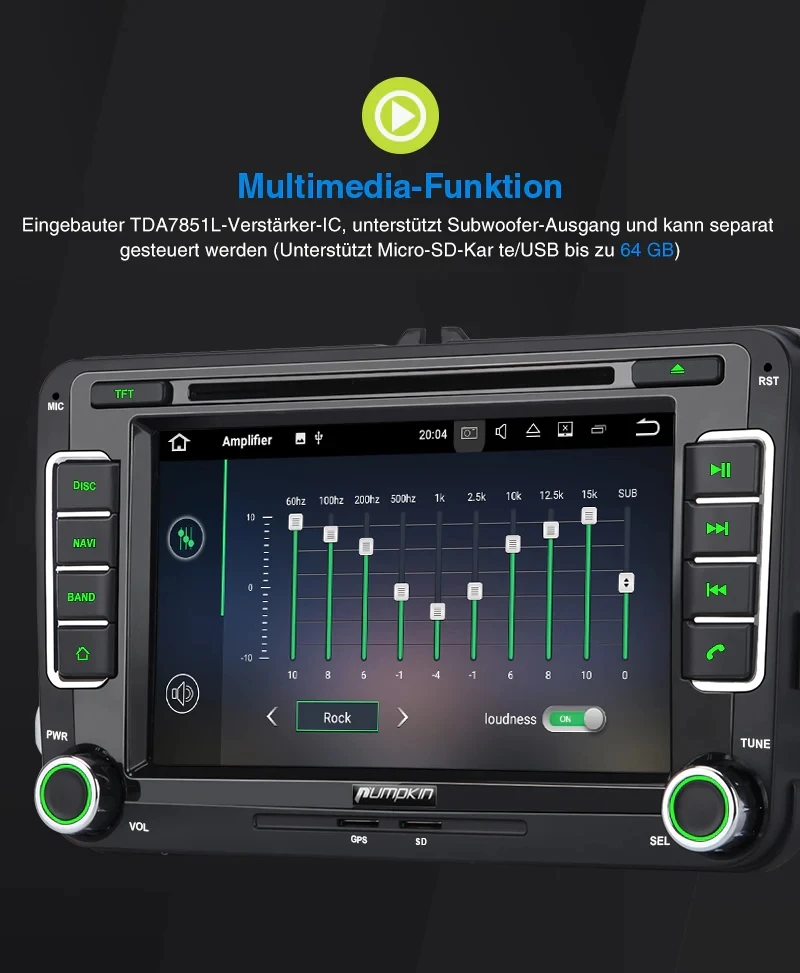 3. Unterstützung von SD / USB- oder Online-Filmquellen (z. B. Youtube) .1080P HD-Video, Subwoofer-Audioausgang und EQ-Einstellung. Die AV-Out-Funktion kann das DVD-Video gleichzeitig für die Fondpassagiere an die Kopfstütze ausgeben. Unterstützungsspiegel Link, der die Online-Navigation von Android-Handys, Apple-Handys oder anderen Anwendungen auf der Autoradio anzeigen kann.