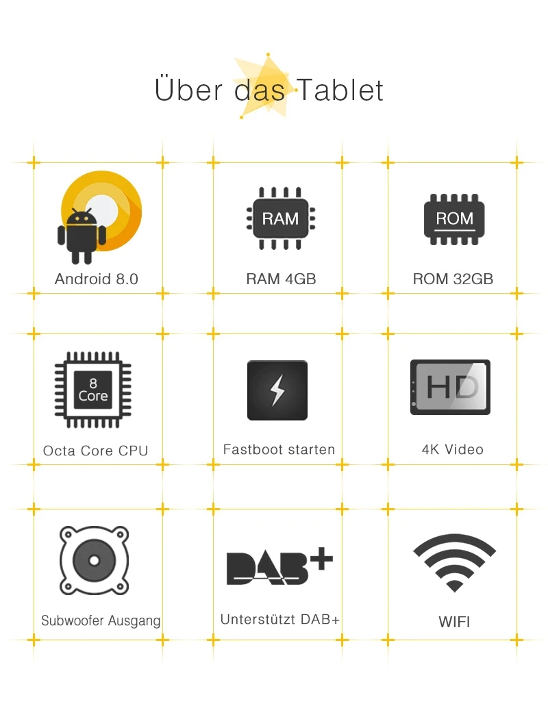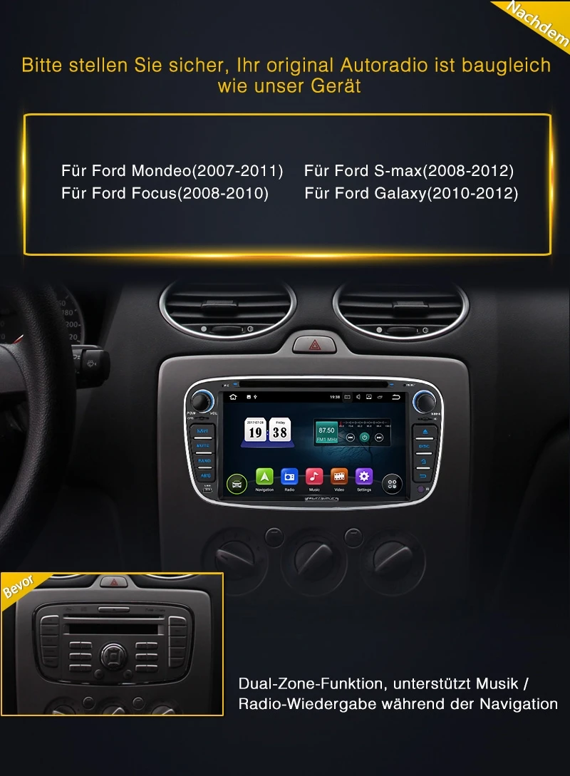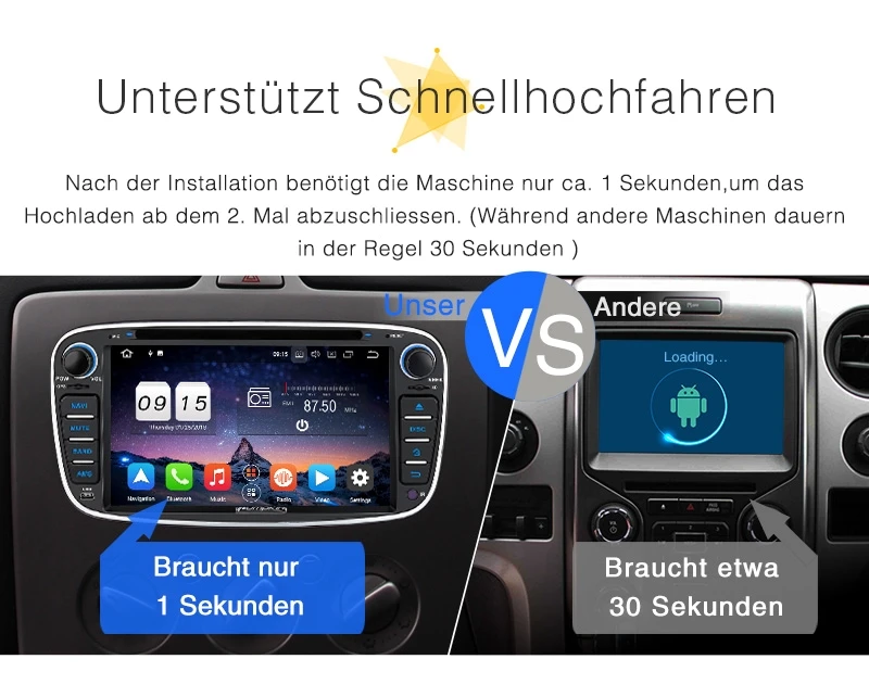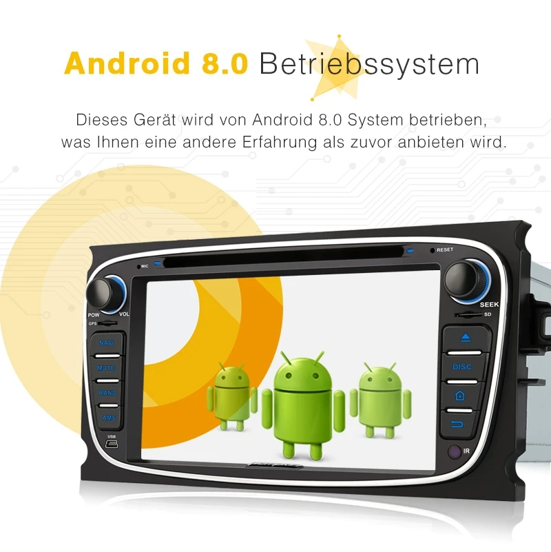 - Android 8.0 Oreo, RAM: 4 GB, ROM: 32 GB, CPU: 8-Core 64-Bit-CPU Coretex-A53 @ 1.5G, hochwertige Radio-IC: NXP TEF6686, mit gutem Radioempfang.