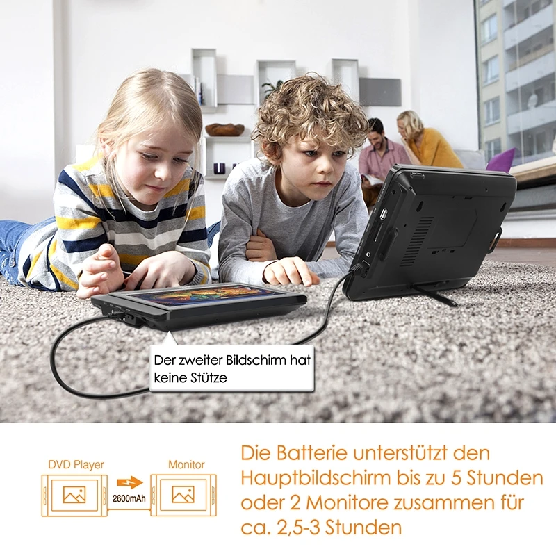 - Built-in wiederaufladbare 2600mAh Lithium-Batterie, der Hauptmonitor des DVD-Players konnte bis zu 5 Stunden Arbeitszeit allein unterstützen, außerdem kann die Batterieleistung zwischen dem Haupt- und dem zweiten Monitor geteilt werden, der ohne eine Steckdose, die beide bedeutet Monitore könnten für etwa 2,5-3 Stunden zusammenarbeiten und das könnte sicherstellen, dass Sie den größten Teil des Films ohne unerwartete Stromunterbrechung genießen können. Stellen Sie eine neue Verbindung zwischen dem Haupt- und dem zweiten Monitor her, damit die Geräte stabiler und zuverlässiger arbeiten.