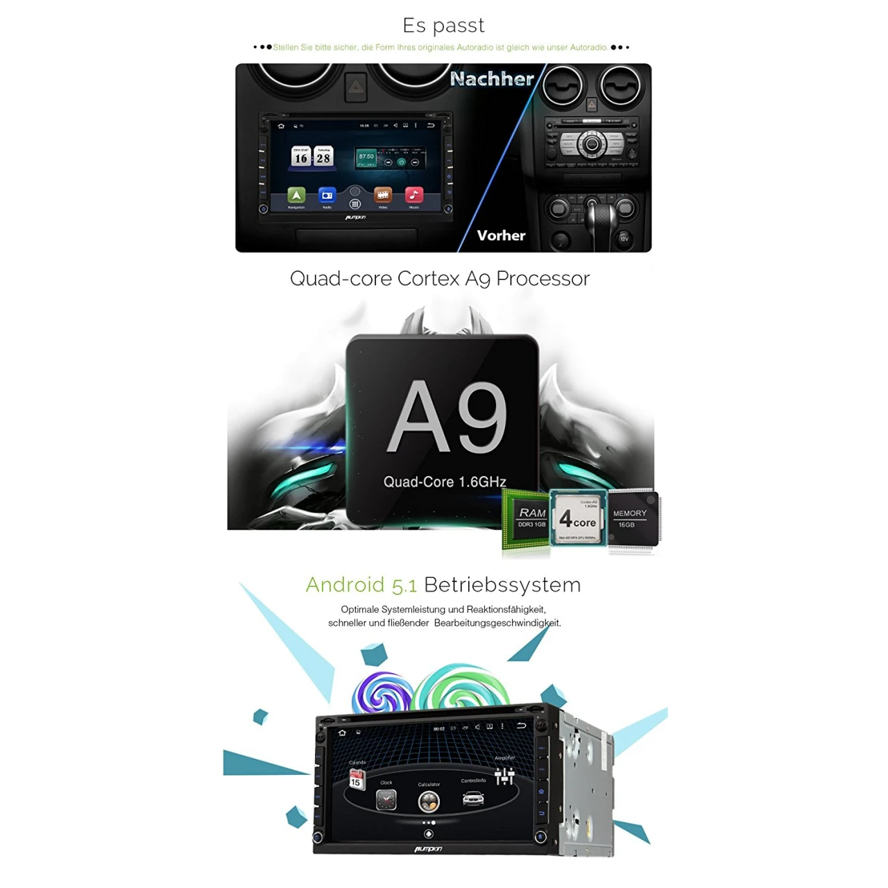 - Betriebssystem: Android 5.1 Lollipop, Hauptprozessor(CPU): Rockchip PX3 Cortex A9 Quad Core 1.6GHz, RAM: DDR3 1GB, Nand Speicher: 16GB, Bildschirmauflösung: 800×480, Audio Ausgangsleistung: Max. 4x50W