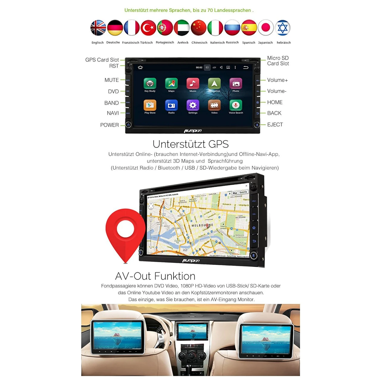 - Dieses Gerät enthält nur Online-Navi-App Google Maps. Sie können andere Navi-Apps in Google Play Store herunterladen.