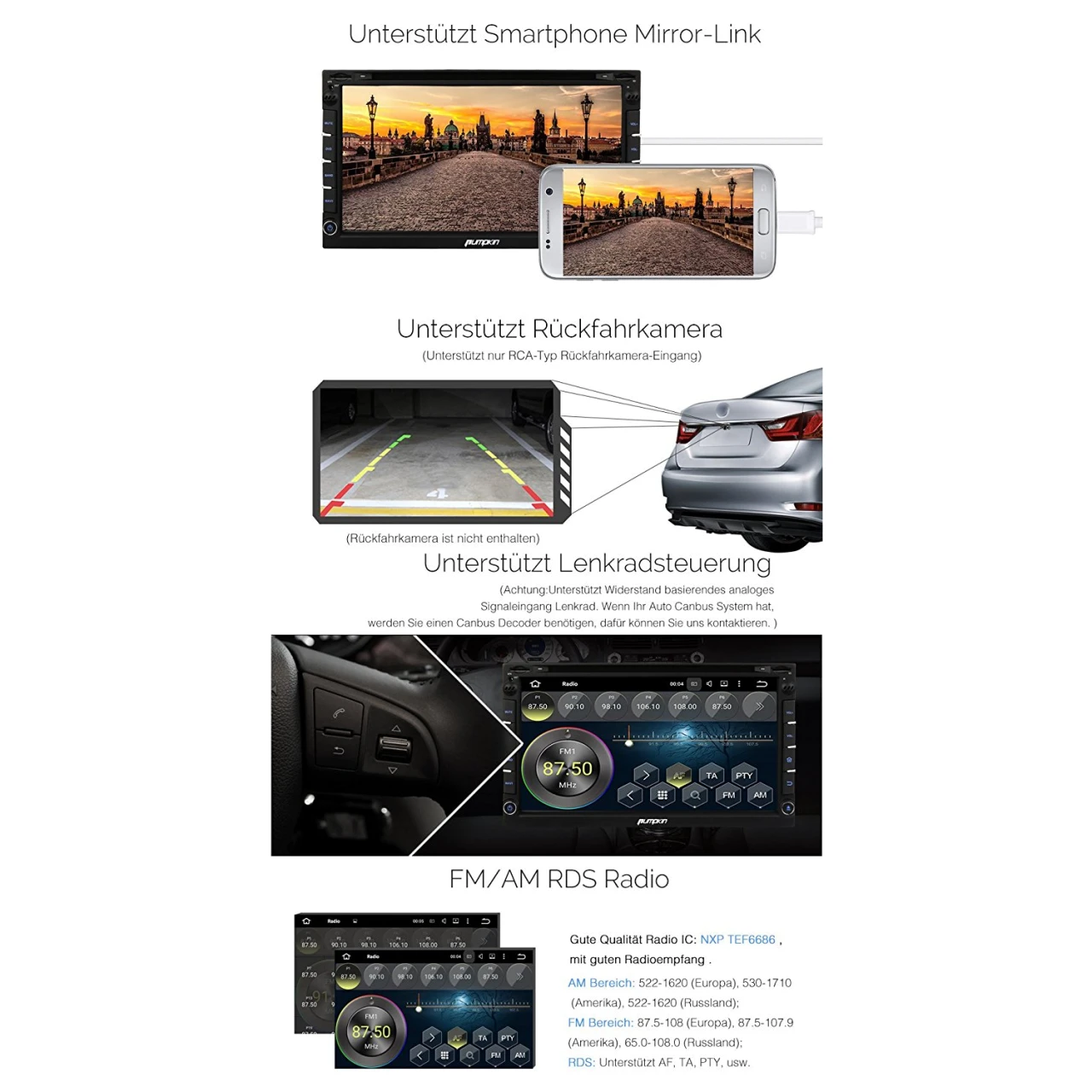 - Unterstützt RCA Rückfahrkamera-Eingang.