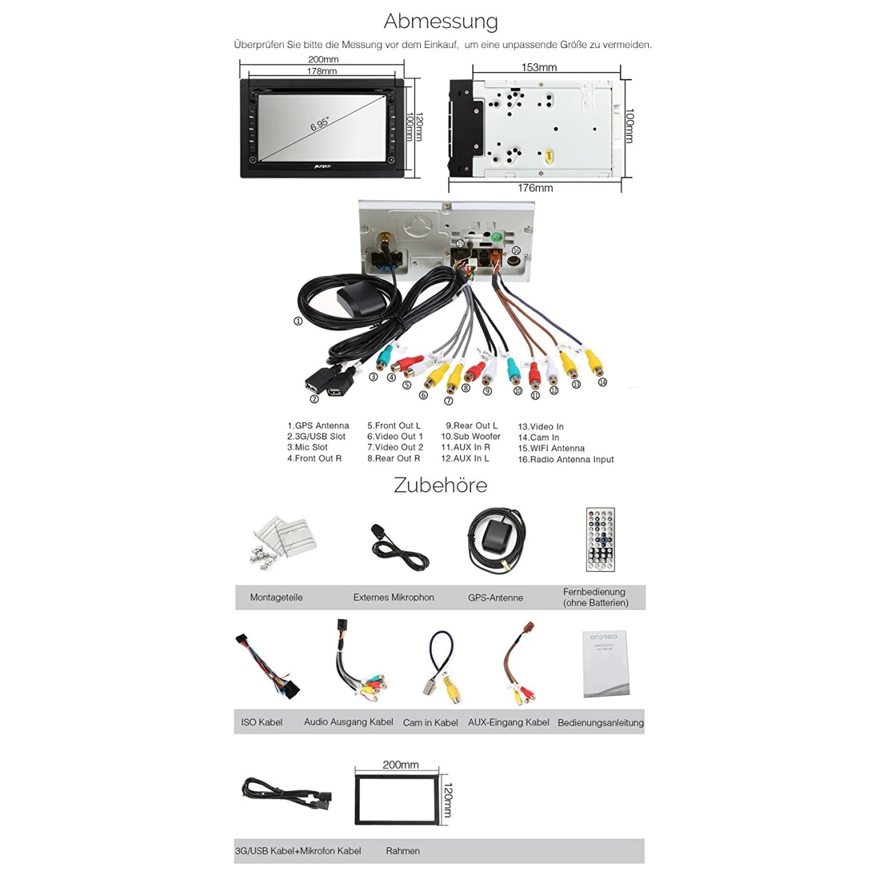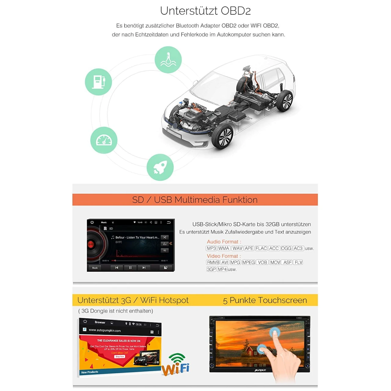 - Unterstützt: Lenkradsteuerung(basierend auf Widerstand Analogeingang), FM, AM, RDS Radio, DAB+ ( Digitalradio ), OBD2, WiFi, 3G, Dashcam, Rückfahrkamera mit Cinch Anschluss