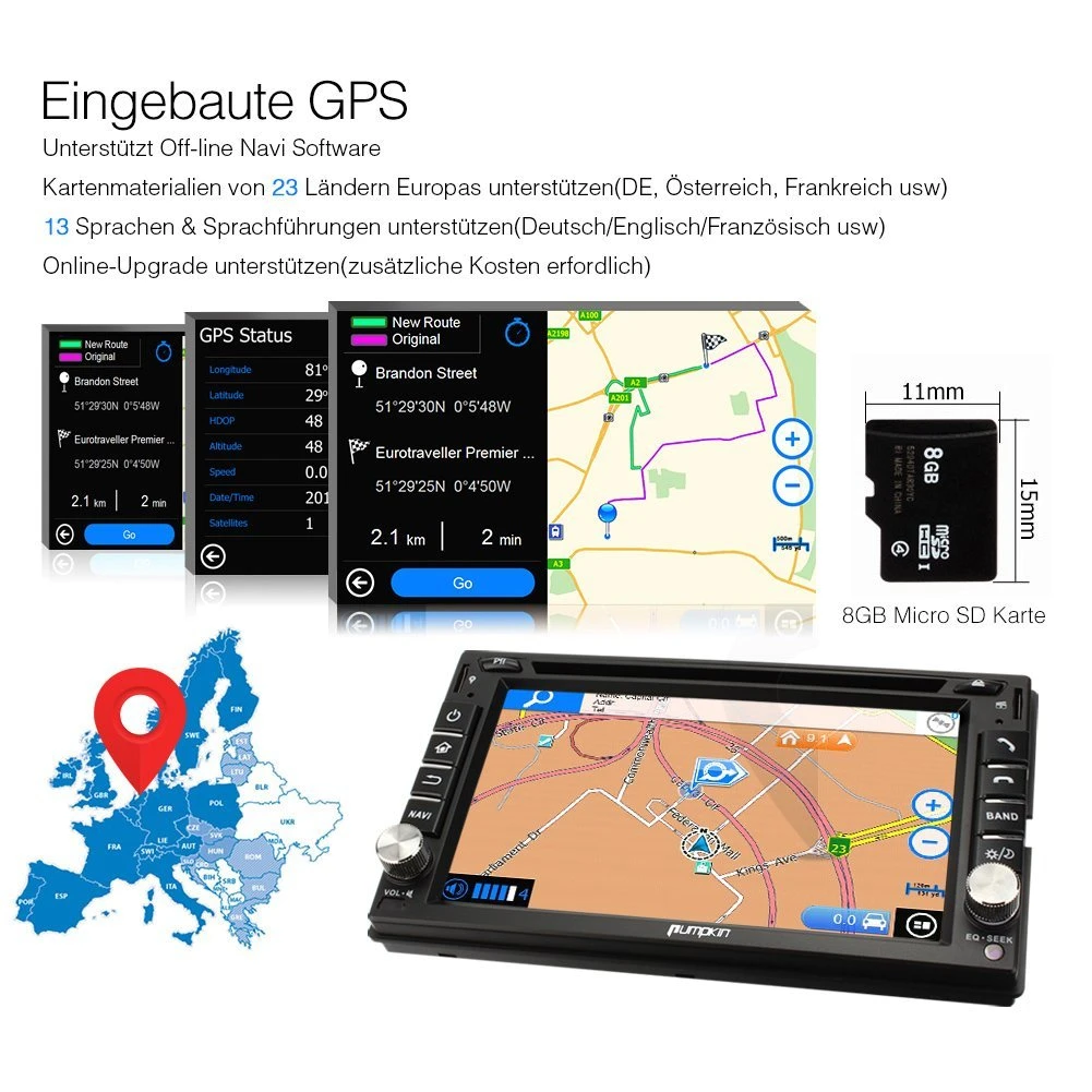 - Unterstützt: GPS(Kartenmaterialien von 23 Ländern Europas, 3D-Karte-Anzeige, POI-Anzeige, Sprachführung, Spurhalteassistent), DVD, CD, VCD, MP3, Bluetooth-Freisprechfunktion, Musikwiedergabe via A2DP, USB, SD, FM, AM, RDS Radio