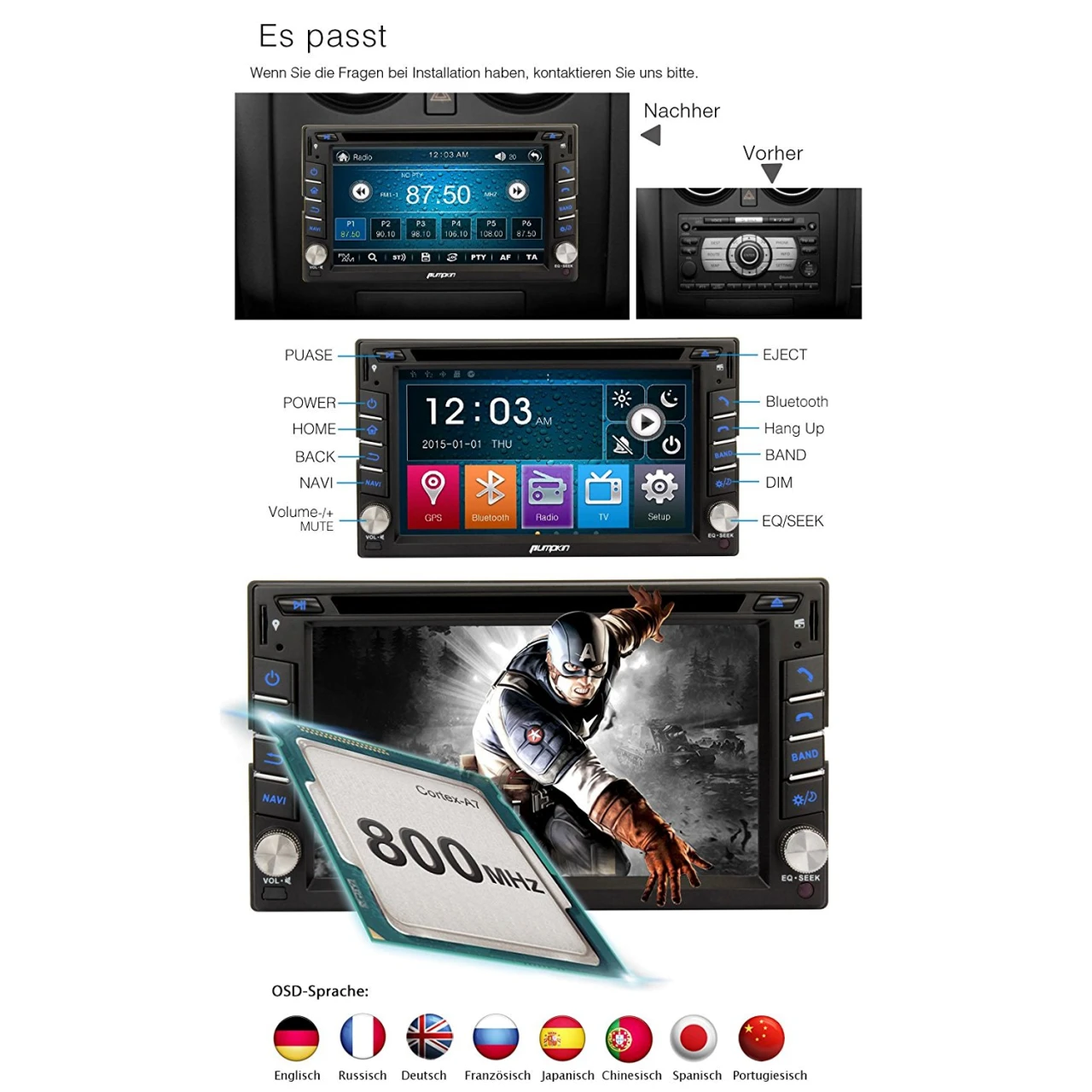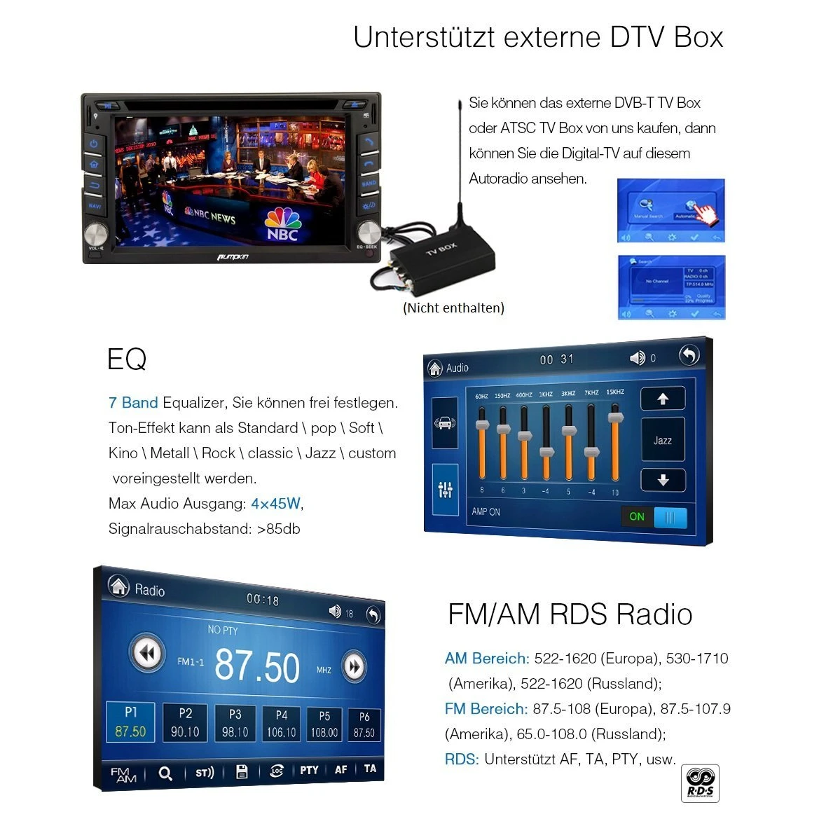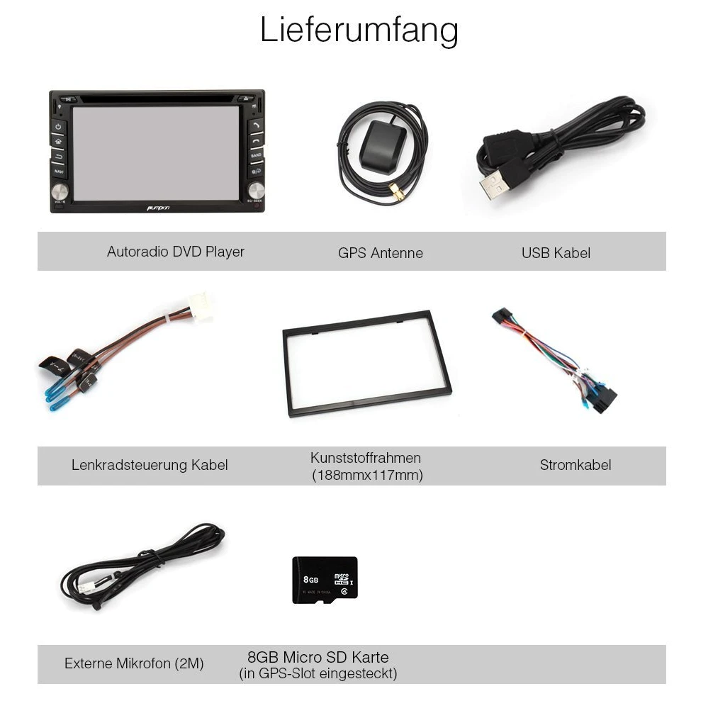 - Unterstützt: Lenkradsteuerung(basierend auf Widerstand Analogeingang), Externes Mikrofon, Subwoofer Audioausgang, Externe DVB-T Box, Rückfahrkamera mit Cinch Anschluss
