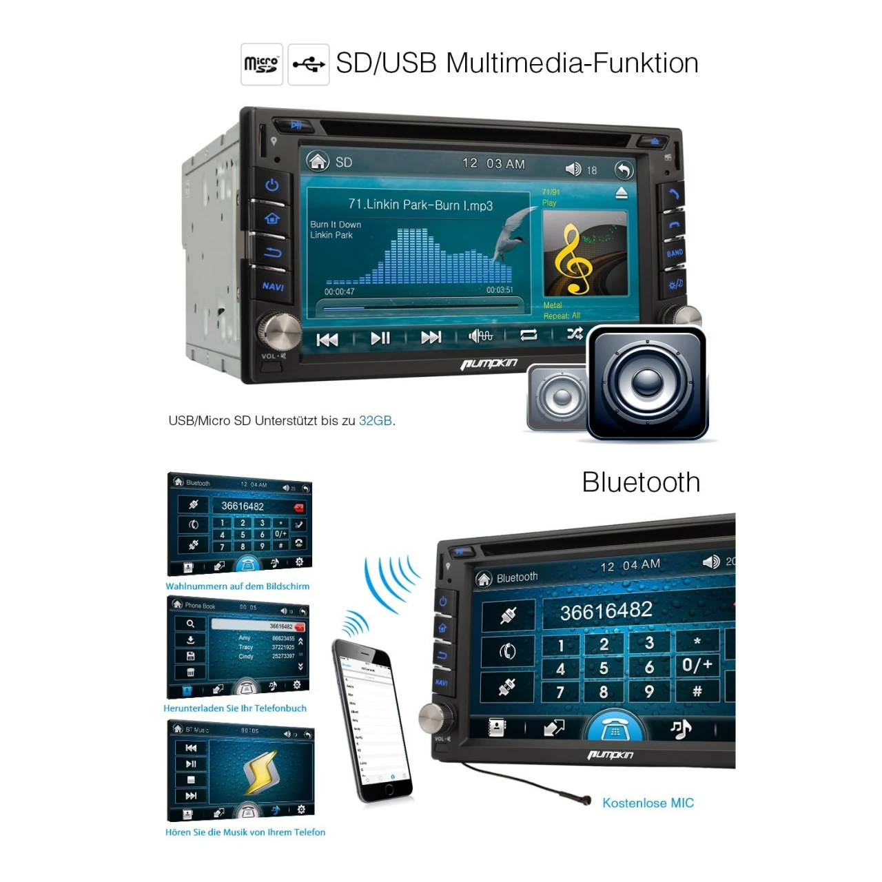 - Unterstützt Bluetooth Audio-Player/Telefonbuch-Funktion