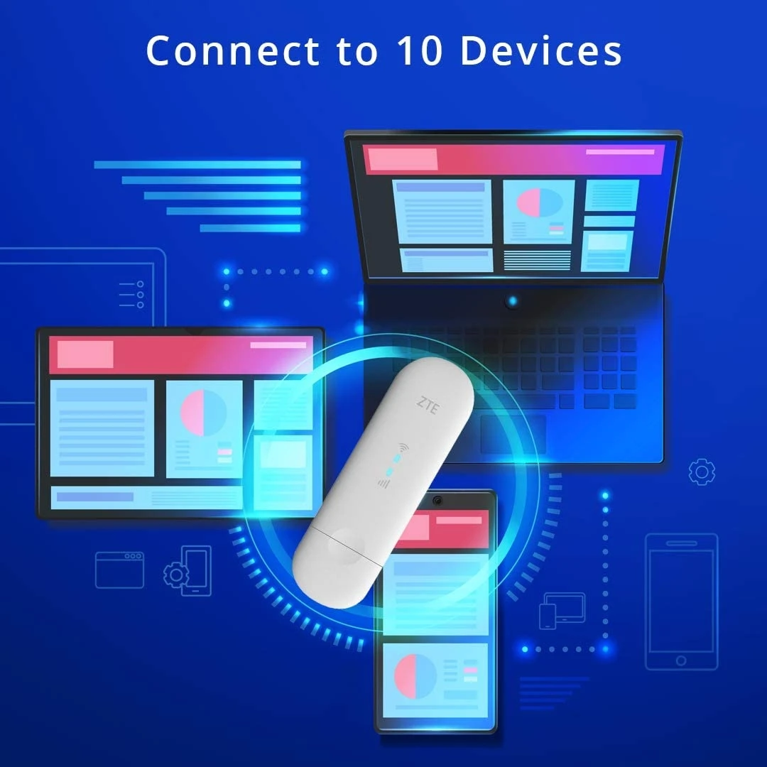 Das ZTE MF79U vereint die Funktionen eines USB-Modem und eines WLAN-Zugangspunkts für bis zu 10 Geräte. Eine breite Palette von unterstützten Frequenzen gewährleistet die Kompatibilität mit drahtlosen Netzwerken von 3G und 4G Standards.
